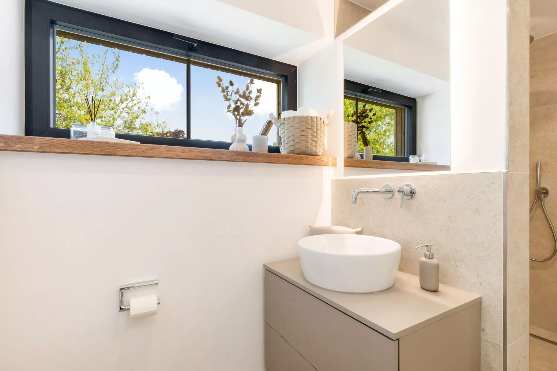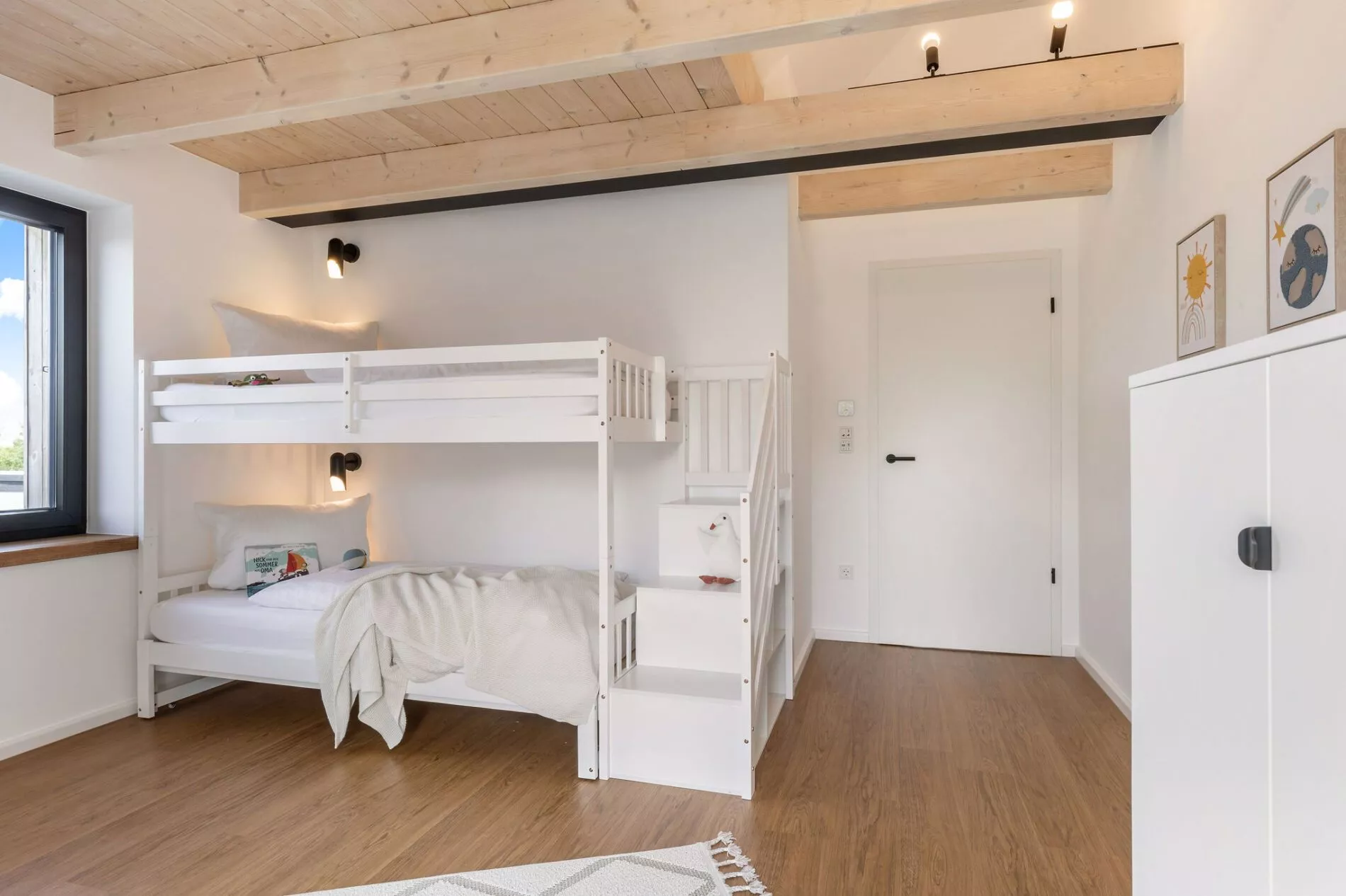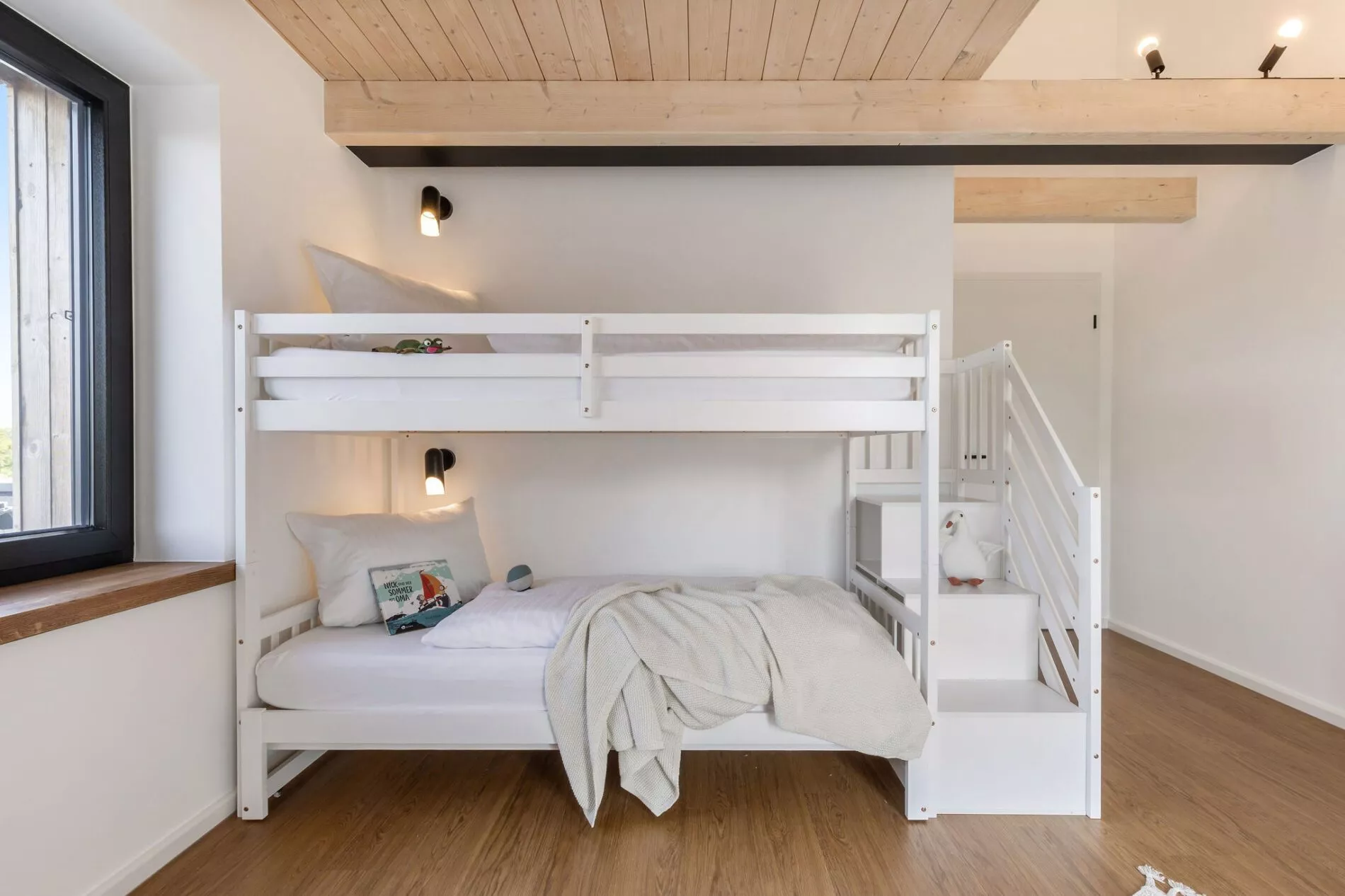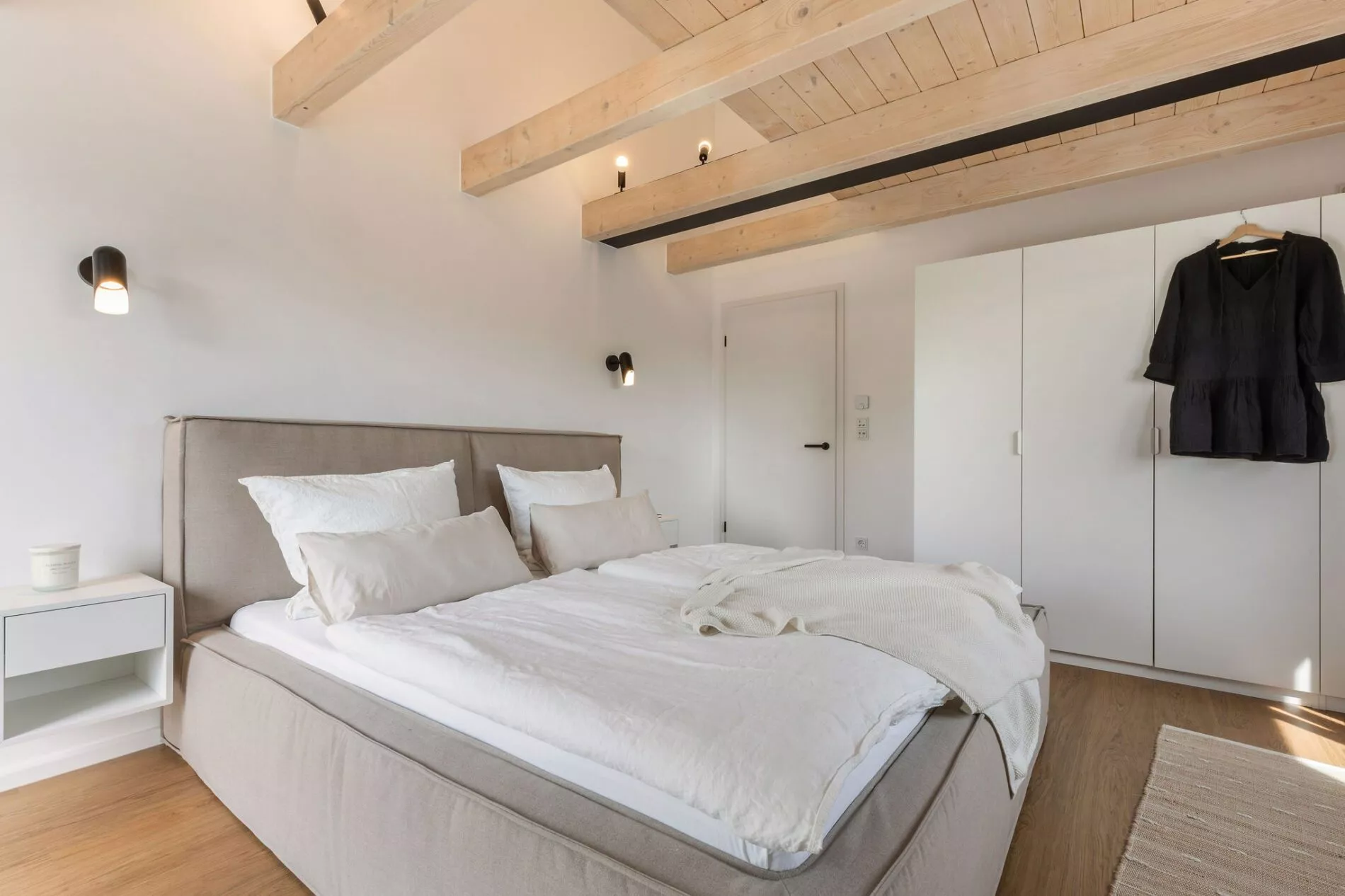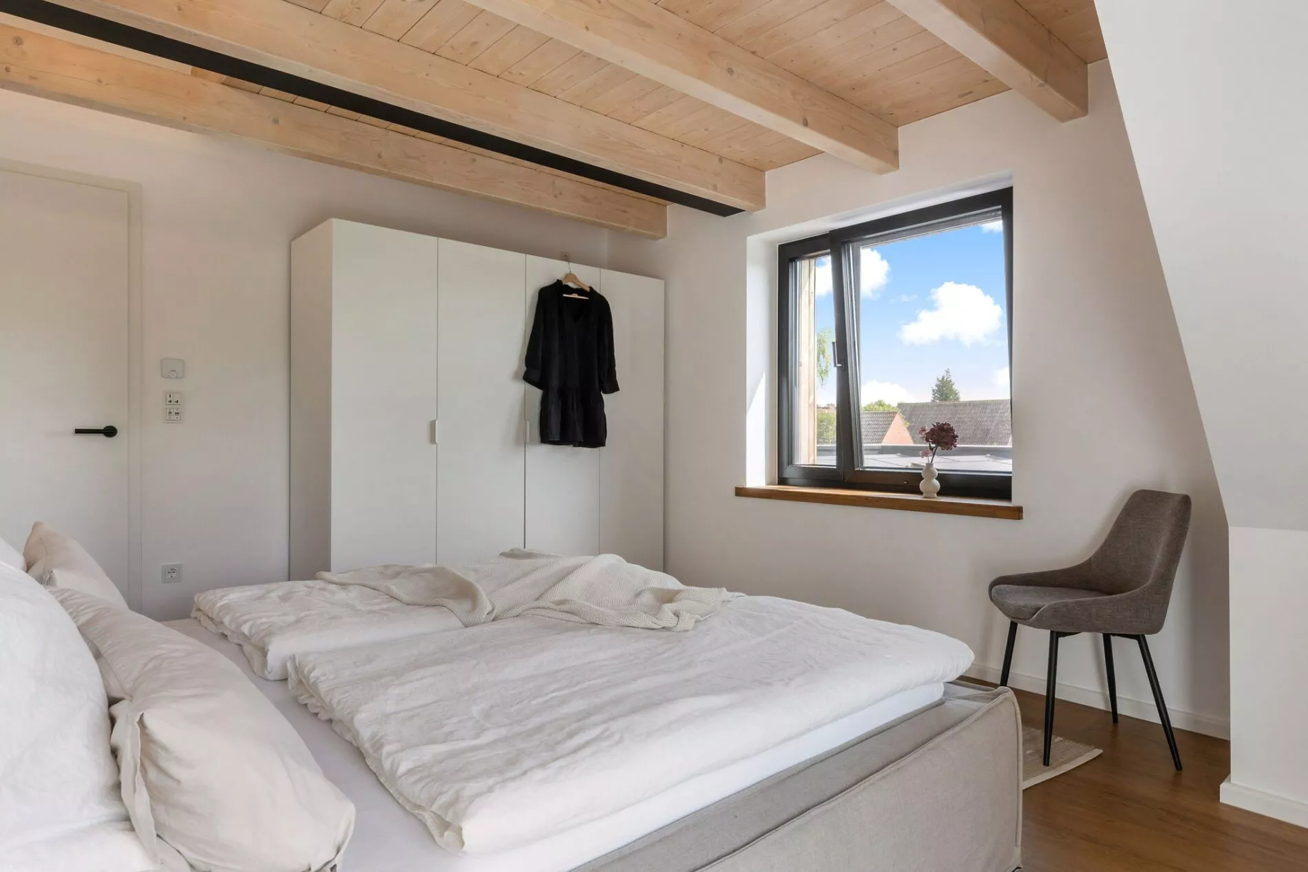 Im Obergeschoss befinden sich drei weitere Schlafzimmer – eines mit einem 240 cm breiten Familienbett, eines mit einem ausziehbaren Etagenbett und ein weiteres mit einem Doppelbett (180 cm). Alle Schlafräume verfügen über offene Balkenlage und elektrische Rollläden für maximale Verdunkelung. Die Terrasse ist mit Gartenmöbeln, Strandkorb und Grill ausgestattet – ideal für entspannte Stunden im Freien. Zur Ausstattung gehören außerdem ein privater Parkplatz, Waschmaschine, Trockner und eine nachhaltige Energieversorgung durch Photovoltaik‑ und Solarthermieanlage. Das Haus ist rauchfrei und haustierfrei – ideal für Allergiker oder Ruhesuchende.