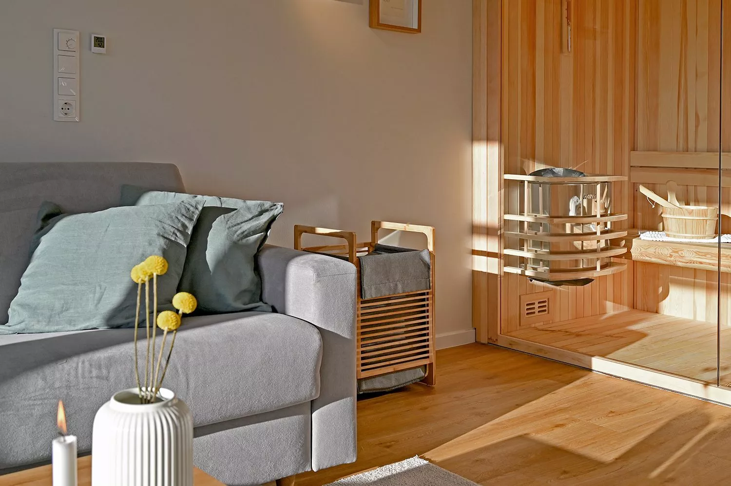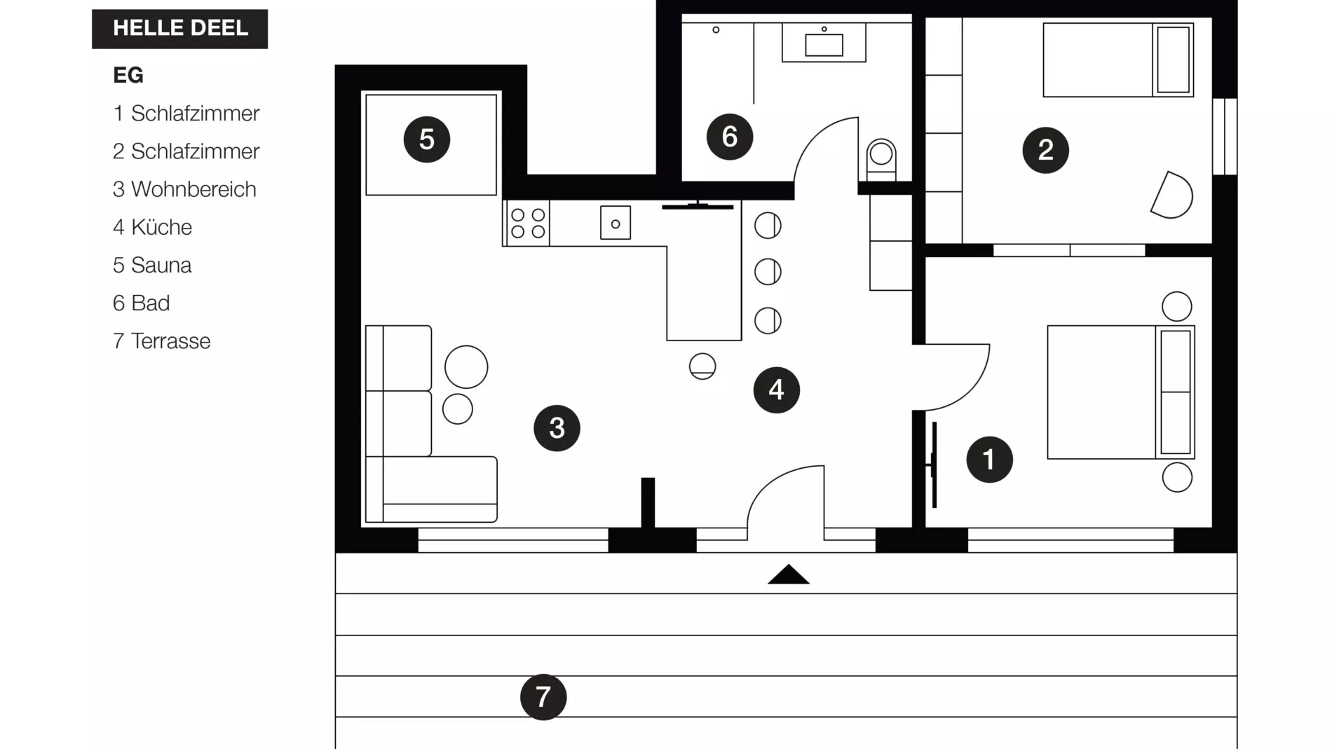 „Helle Deel“ besticht durch ihre sonnige Ausrichtung nach Süden und großzügige Fensterfronten, die viel Licht hereinlassen. Highlight ist der kleine Wellnessbereich mit Sauna und bodenebener Regendusche.