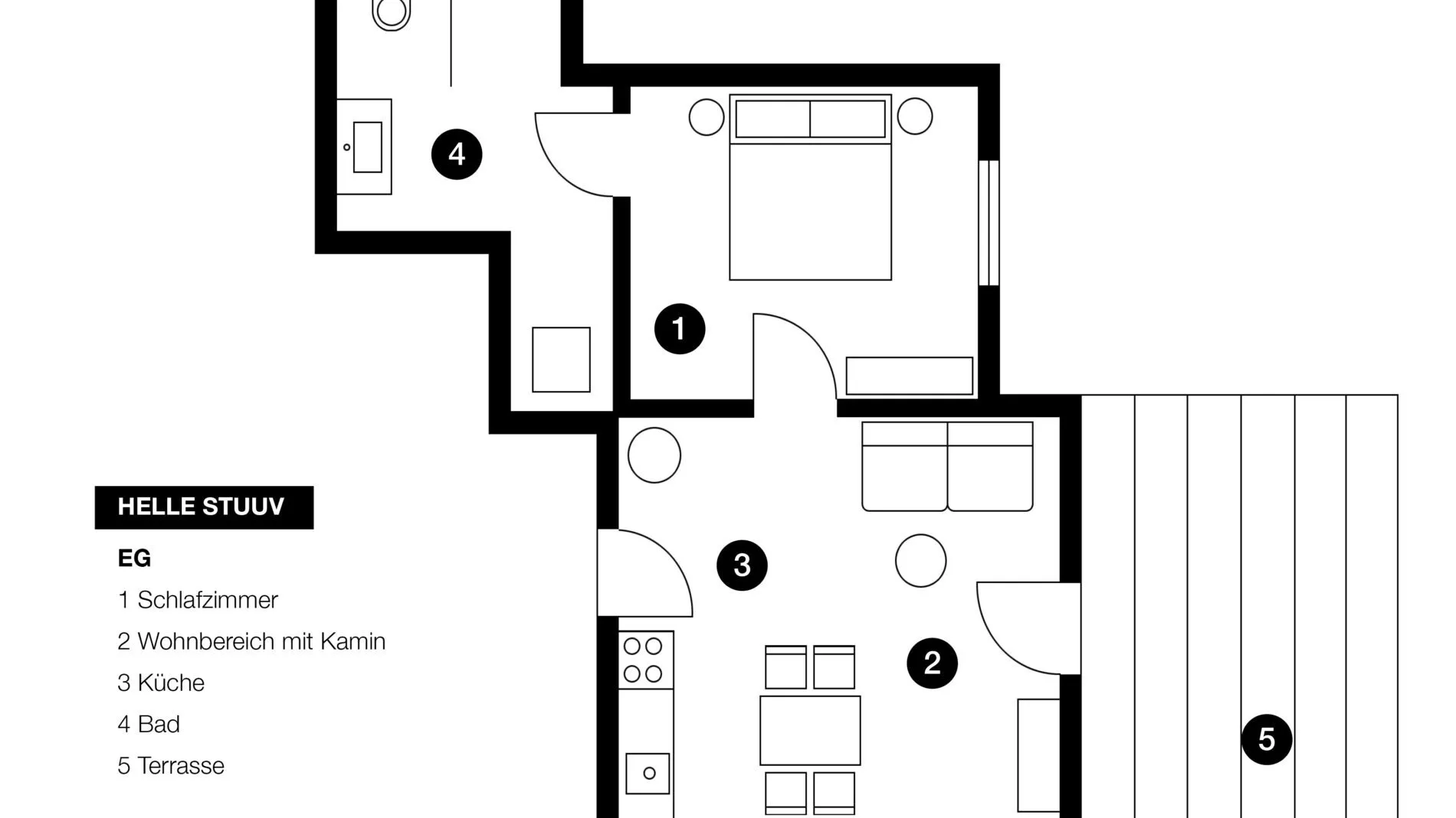 Die ca. 65 m² große Ferienwohnung Helle Stuuv bietet Platz für 2 Personen. Sie verfügt über ein Schlafzimmer mit hochwertigem Boxspringbett, ein modernes Badezimmer mit bodengleicher Dusche und Rainshower sowie eine voll ausgestattete Wohnküche. Der helle Wohnbereich ist mit einem gemütlichen Sofa und einem Kaminofen ausgestattet. Eine große Südterrasse mit Strandkorb lädt zum Entspannen ein. WLAN, Fernseher, Bettwäsche, Handtücher (Erstausstattung) und die Nutzung der Waschmaschine sind im Preis inklusive.