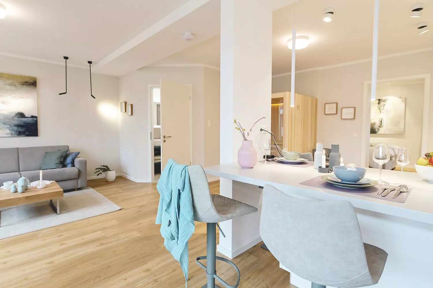 In der exklusiven Ferienwohnung Klöönstuuv kannst du dich einfach wohlfühlen. Die Erdgeschosswohnung bietet auf 70 m² Platz für 2 bis 4 Personen und ist über einen eigenen Hauseingang bequem erreichbar. Im Schlafzimmer wartet ein großes Boxspringbett (180×200) auf dich, während im Wohnbereich das Schlafsofa mit Longchair schnell in ein weiteres Doppelbett (140×200) verwandelt werden kann. Die offene, voll ausgestattete Kücheninsel lässt keine Wünsche offen und lädt zum gemeinsamen Kochen ein.