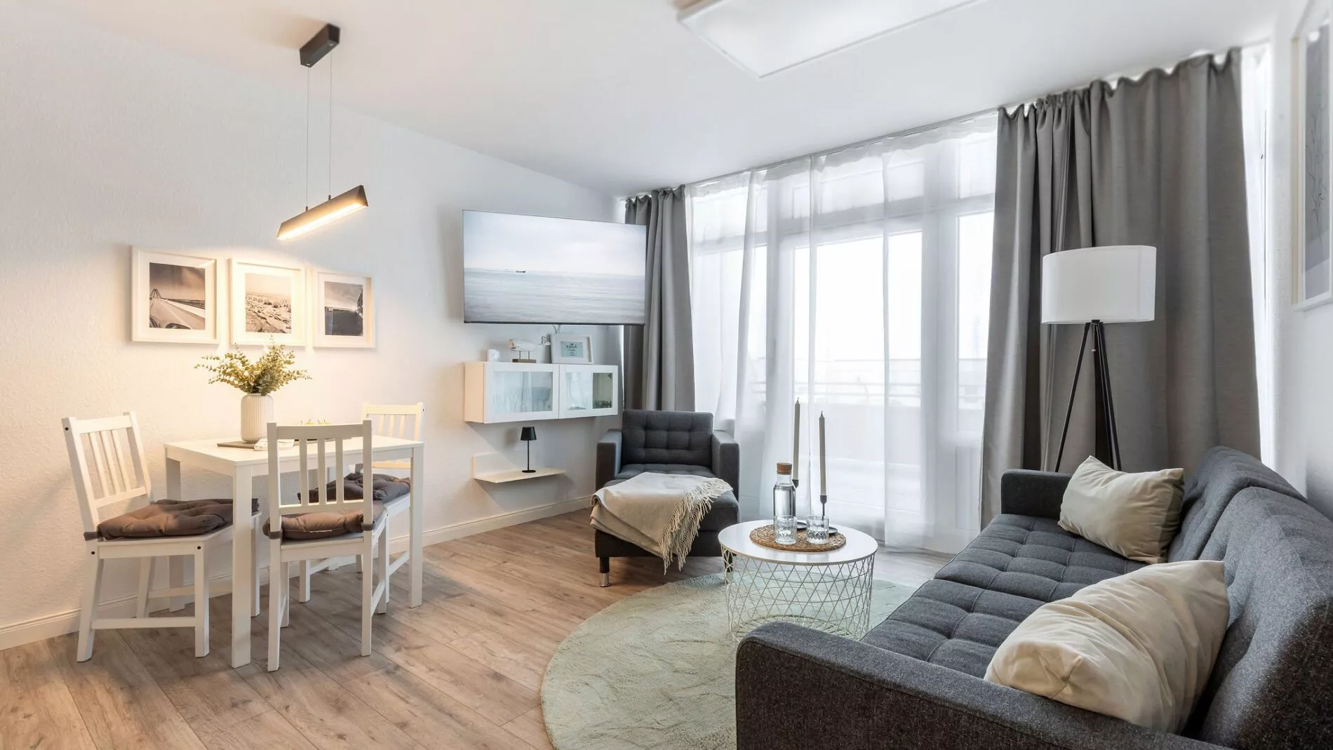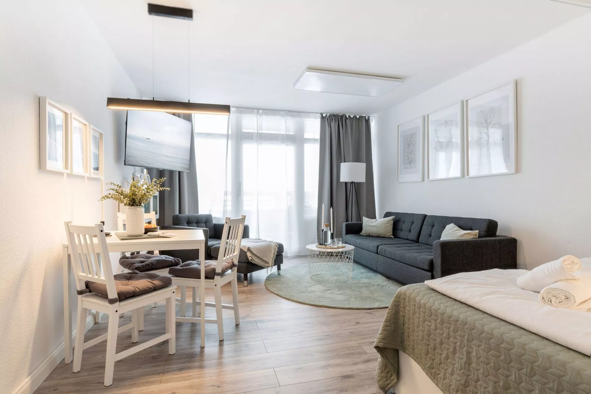 Die stilvolle Ferienwohnung Sea la Vie bietet auf ca. 34 m² Wohnfläche Platz für bis zu 3 Personen. Sie verfügt über einen offen gestalteten Wohn- und Schlafbereich mit einem komfortablen Bett (160 × 200 cm) sowie einem Schlafsofa (140 × 200 cm). Die gut ausgestattete Küchenzeile ermöglicht eine unkomplizierte Selbstversorgung, während das moderne Bad den Wohnkomfort abrundet. Die Erdgeschosswohnung überzeugt mit einer großzügigen Terrasse mit seitlichem Meerblick, die zu entspannten Stunden an der frischen Ostseeluft einlädt.