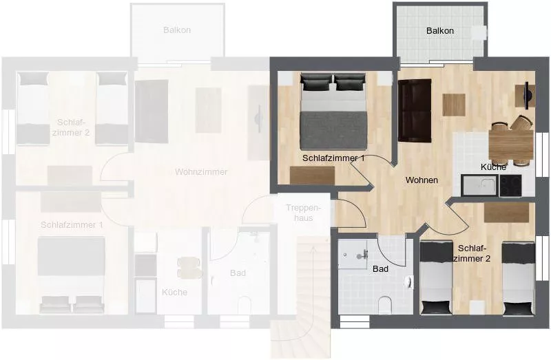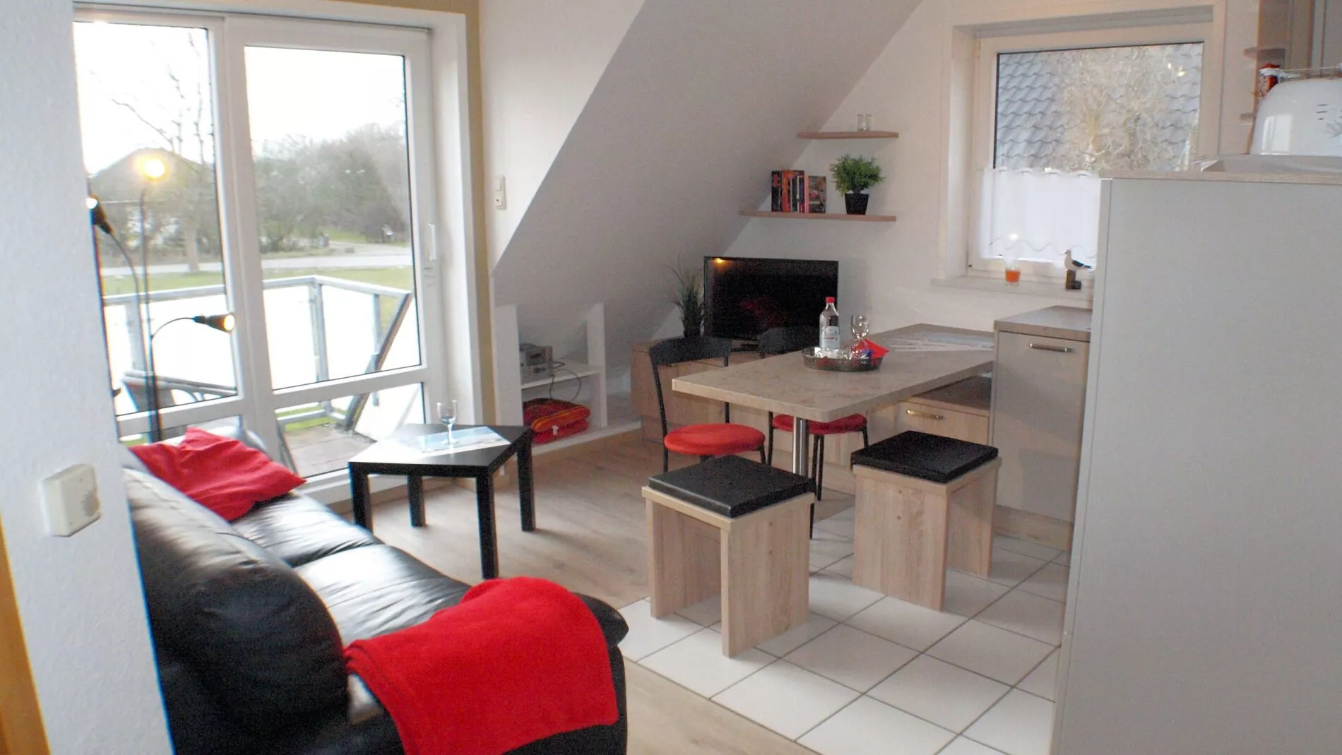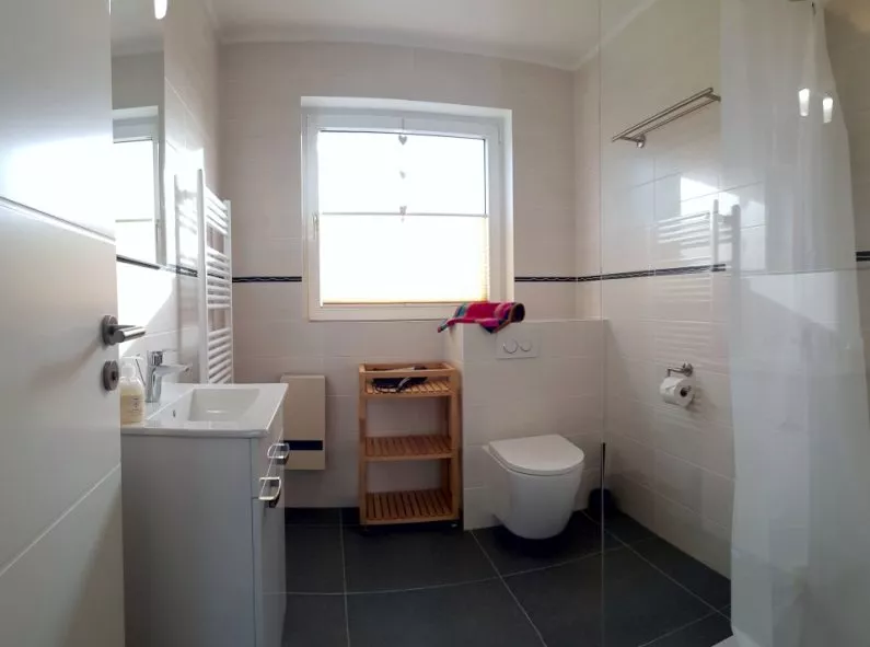 Ferienwohnung mit 48 qm² für bis zu 4 Personen, inkl. 2 Schlafzimmern (ein Doppelbett, zwei Einzelbetten), Wohnbereich mit offener Küche, renoviertem Duschbad, Smart-TV, Internet und Parkplatz. Sonniger Balkon sowie großer Gemeinschaftsgarten mit Liegewiese und Spielgeräten.